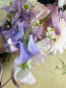 ブライダルブーケをお預かりしました。結婚式のブーケは、春色ブーケになっています。ご結婚おめでとうございます。
